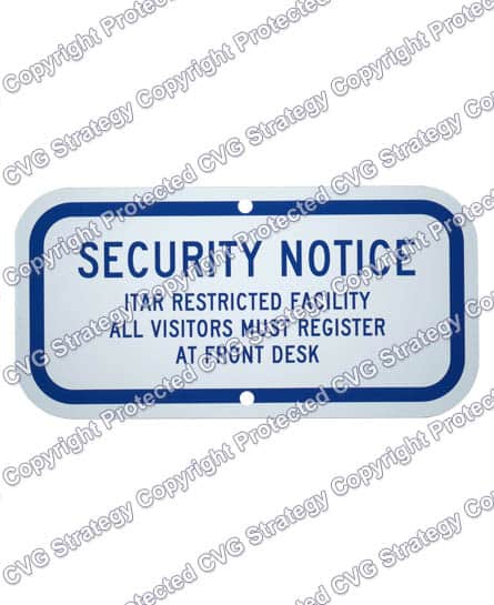Manufactured specially for CVG Strategy, our customized 6×12″ Aluminum ITAR Compliance Sign will last years and is suitable for indoor or outdoor applications.