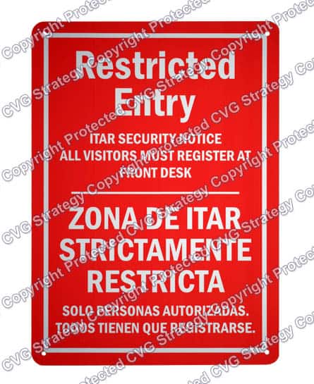 Manufactured specially for CVG Strategy, our customized 10×14″ Aluminum “Restricted Entry Bilingual ITAR Sign” will last years and is suitable for indoor or outdoor applications. This is a large sign well suited to place outside to be visible at a distance or inside a facility for area control.